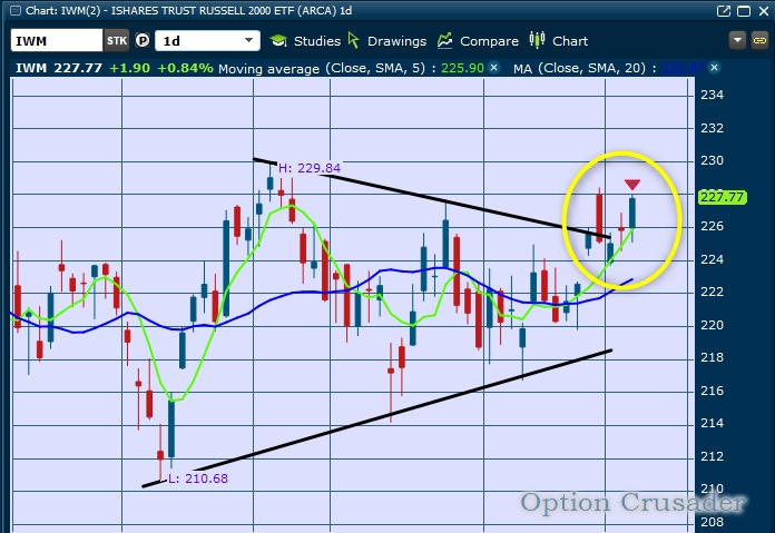 An update on IWM Call Spread. IWM reaches the frontline of defense threatening a breakthrough the all time high it reached in the beginning of March 2021 where it topped out at 234.53. Now what? Will it retread or advance?